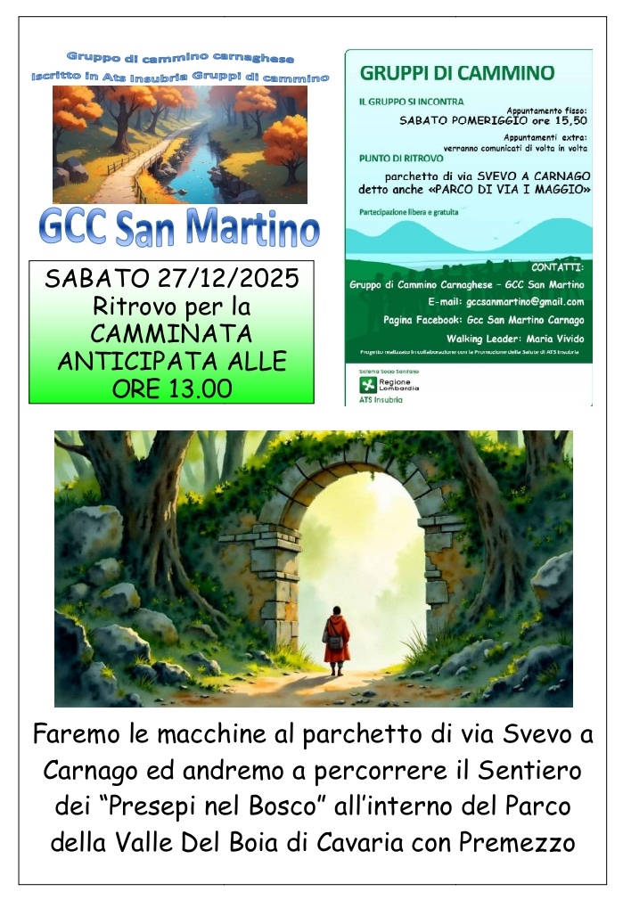 Cammino, natura e atmosfera natalizia: sabato 27 dicembre 2025 il Gruppo di Cammino Carnaghese “GCC San Martino” propone una camminata speciale sul Sentiero dei “Presepi nel Bosco”, all’interno del Parco della Valle del Boia, tra Cavaria con Premezzo e dintorni. Il ritrovo è anticipato alle ore 13.00 al parchetto di via Svevo a Carnago (detto anche “Parco di via I Maggio”).